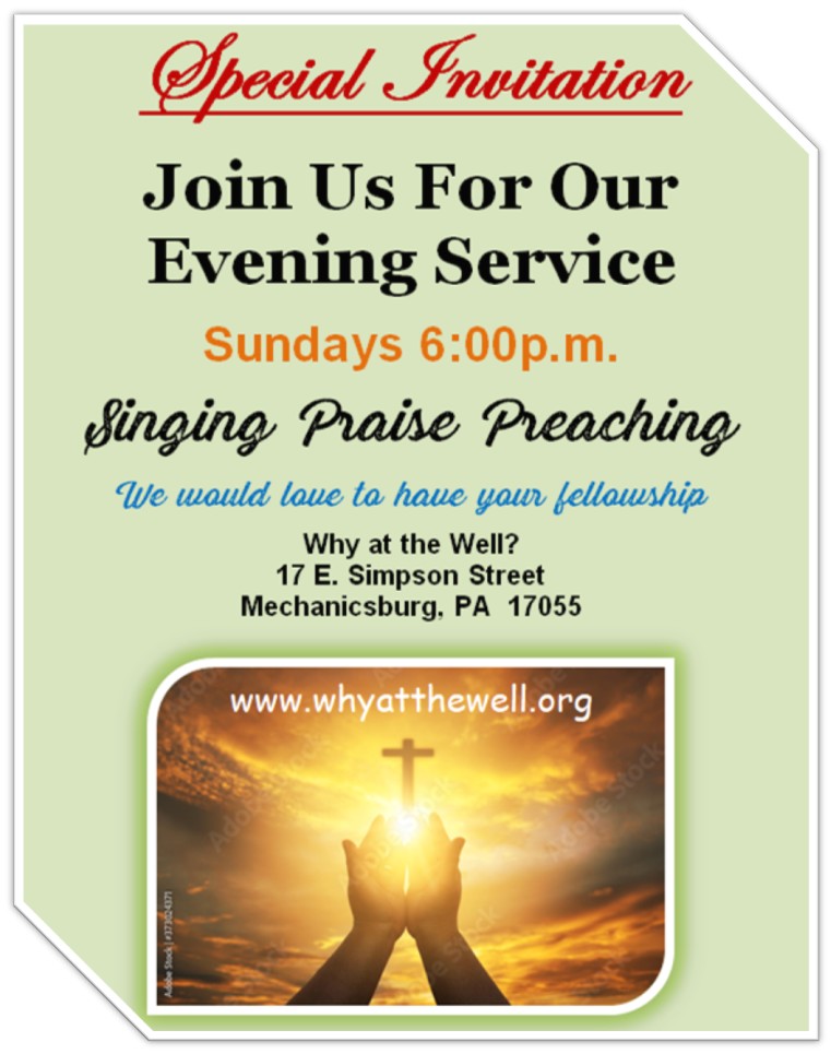 If you don't have a place to worship on Sundays or Wednesdays, please consider joining us as we worship our great God and King the Lord Jesus Christ.
